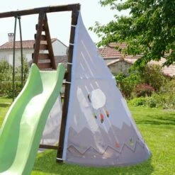 CertifiĂ© aux normes de sĂ©curitĂ© applicables aux jeux d’enfants, le tipi convient aux plus de 3 ans. C’est une extension intĂ©ressante pour crĂ©er un nouvel univers sans pour autant changer de portique. L’aire de jeux proposĂ© aux enfants s’en voit agrandi. Il se fixe en haut du portique et offre une large surface de jeu supplĂ©mentaire, qui plus est dissimulĂ© pour encore plus de plaisir. Vos enfants y passeront assurĂ©ment des heures entières sans se lasser. C’est Ă©galement un excellent moyen de dĂ©velopper son imaginaire puisque les enfants n’auront aucun mal Ă se glisser dans la peau d’un sioux ou d’un apache. Et vous pourrez continuer Ă vous prĂ©lasser dans votre chaise longue.