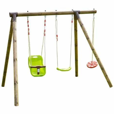 Envie de proposer à votre enfant des activités ludiques en plein air ? Optez pour le portique Tiago ! Il dispose de trois agrès : une balançoire bébé avec tablette de maintien, une balançoire classique avec assise et cordes pour se tenir avec les deux mains et une balançoire disque !
