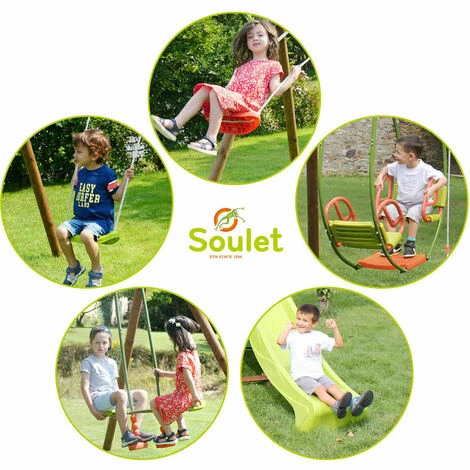 EquipĂ© d’un toboggan, de deux sièges balançoires, d’un vis-Ă -vis et d’une balançoire double nacelle, ce portique proposera une multitude d’activitĂ©s pour petits et grands !