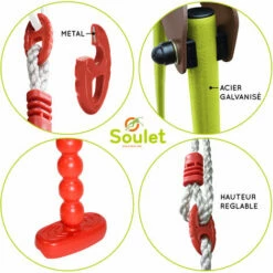 – Siège balançoire n°1 : Plastique vert, Largeur 14 cm x Longueur 67 cm, Poids max supportĂ© : 50 kg
