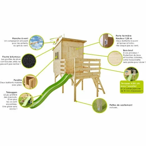 Cette cabane atteint une hauteur de 90 cm au-dessus du sol. VĂ©ritable refuge pour vos enfants, cette maisonnette est Ă©quipĂ©e d’un toboggan qui plaira aux petits aventuriers, adeptes de glissade.