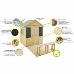 A l’intĂ©rieur, les enfants disposeront d’une surface de jeu d’1,35 m² Ă laquelle s’ajoute une terrasse en bois pour une surface totale de 2,87 m². Pour plus de confort, le plancher est renforcĂ©, atteignant ainsi une Ă©paisseur de 16 mm.