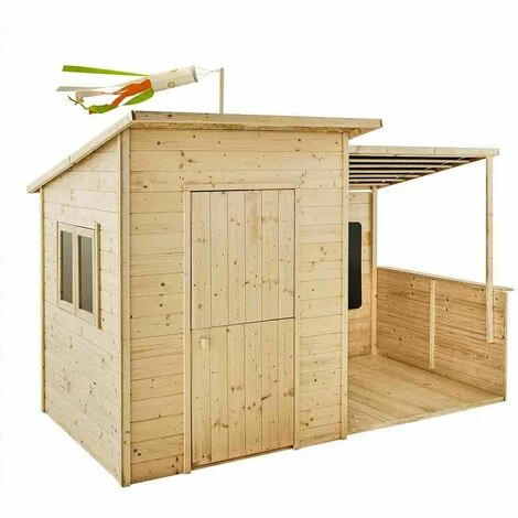 Cette maisonnette en bois brut San Diego peut accueillir jusqu’Ă 4 enfants en mĂŞme temps, de 3 Ă 12 ans.