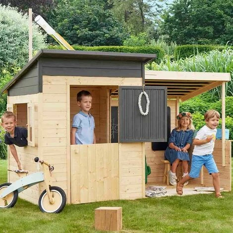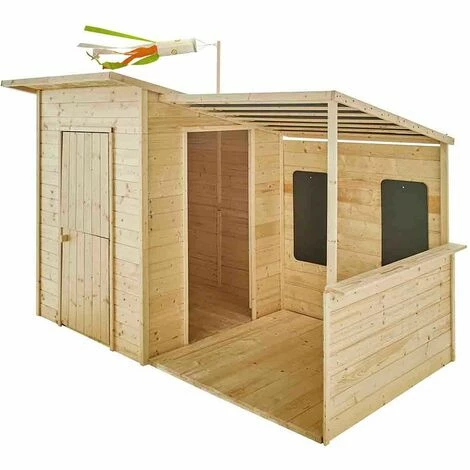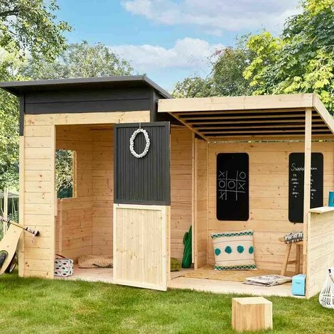 Contemporaine, cette cabane en bois est accessoirisée d’un préau qui offre aux enfants une surface de jeu plus importante de 2,89 m². Une ouverture latérale permet aux deux espaces de communiquer facilement. Pour jouer dehors, tout en étant abrité, le préau est idéal ! Naturellement, petits et grands prendront plaisir à s’approprier cette cabane en bois Soulet qui deviendra leur endroit préféré pour jouer, grandir et se créer des souvenirs.